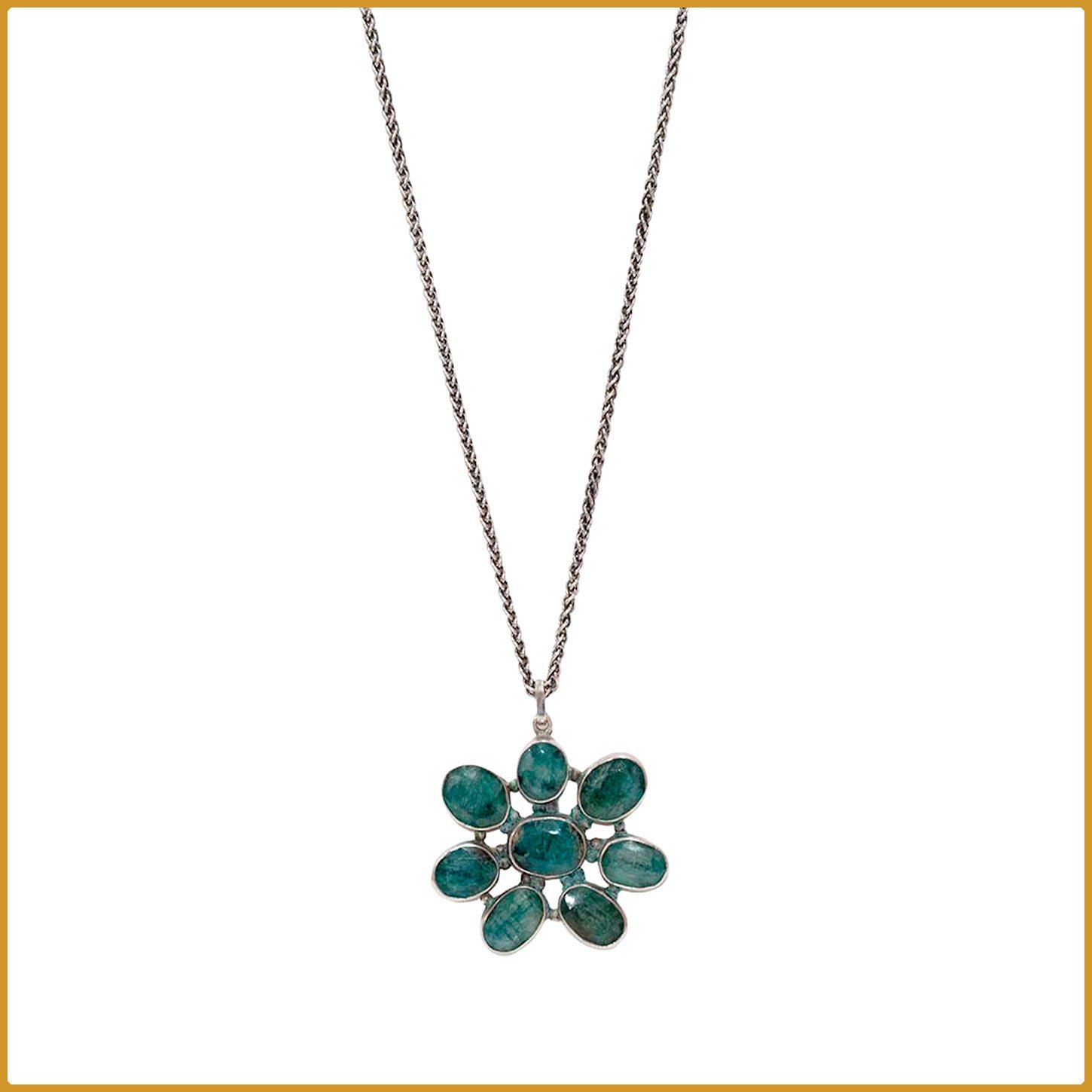 Chaîne en argent et pendentif motif fleur en pierre émeraude.