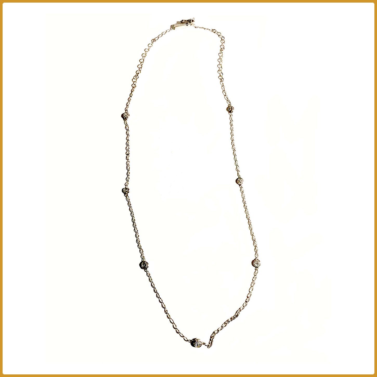 Chaîne en or blanc avec sept petits anneaux et diamants.