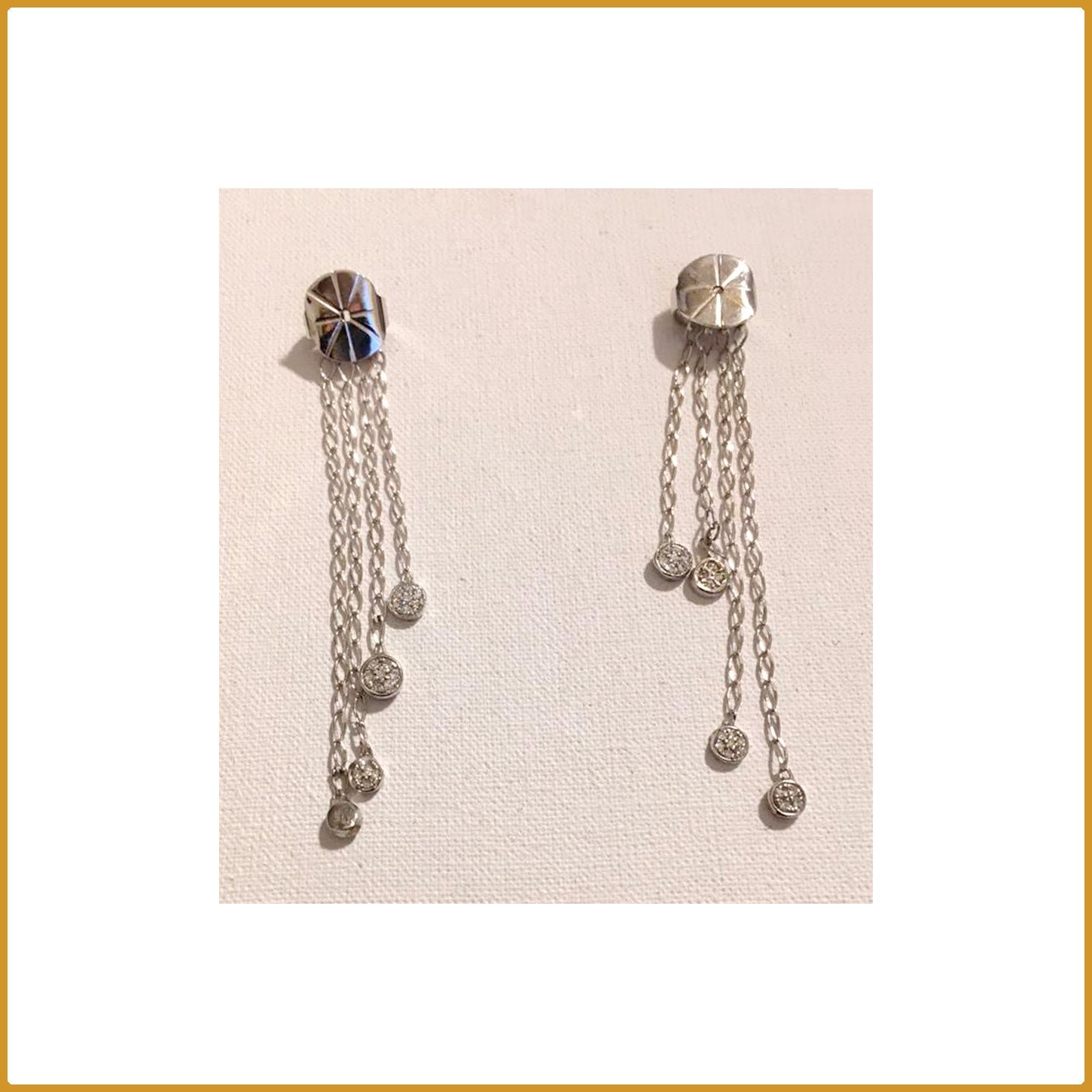 Longues boucles d’oreilles en or blanc 14 carats et quatre petits anneaux avec diamants.